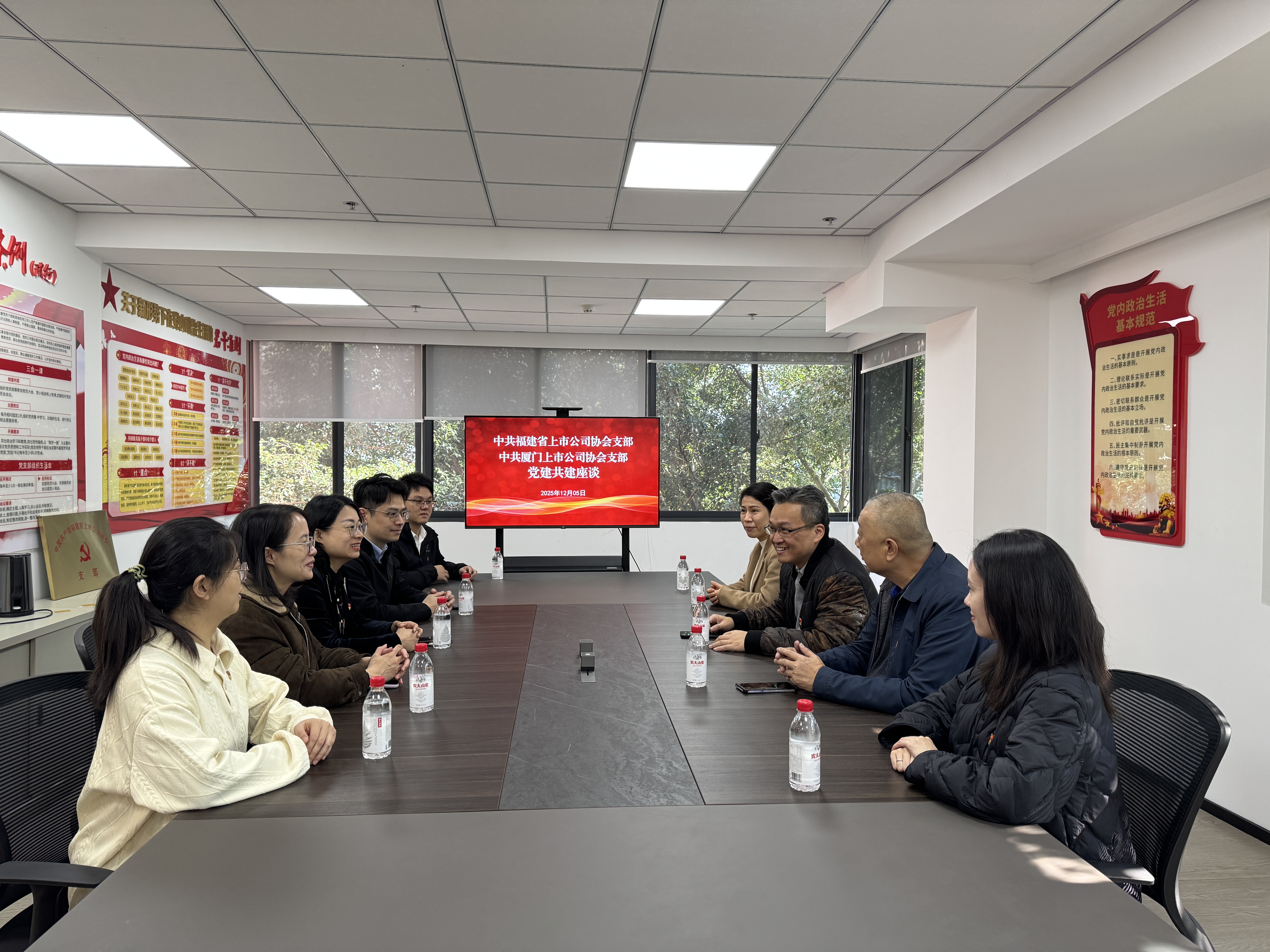 之后,雙方開(kāi)展黨建工作座談,圍繞黨建工作機(jī)制建設(shè)、黨員教育管理、黨組織活動(dòng)開(kāi)展等方面的經(jīng)驗(yàn)做法等話題展開(kāi)交流,并與廈門上市公司協(xié)會(huì)達(dá)成一致:構(gòu)建互學(xué)互鑒機(jī)制,定期舉辦工作交流,共同探尋協(xié)會(huì)黨建及業(yè)務(wù)工作的新方法。